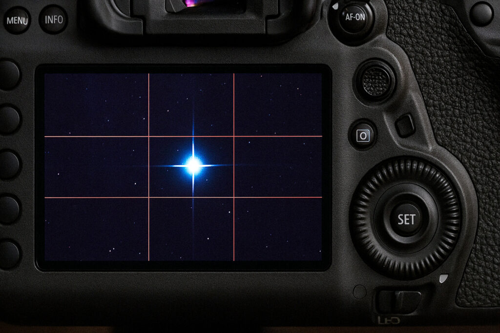 Die gängigste Methode für den Einstieg beinhaltet die Nutzung des Live-View-Modus der Kamera. Man wählt dabei einen ausreichend hellen Stern als Referenzobjekt im Kamerasucher oder Display aus. Durch Aktivieren der maximalen digitalen Vergrößerungsfunktion der Kamera wird der ausgewählte Stern auf dem Display stark vergrößert dargestellt. Anschließend wird der Fokusring des Objektivs behutsam und schrittweise verstellt. Dies geschieht, bis das helle Objekt im vergrößerten Ausschnitt seine kleinste und schärfste Gestalt annimmt.