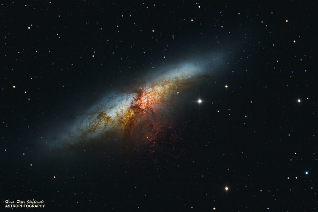 M82, auch bekannt als die „Zigarre-Galaxie“, ist eine markante Balkenspiralgalaxie im Sternbild Großer Bär. Sie befindet sich etwa 12 Millionen Lichtjahre entfernt und ist eine der auffälligsten Galaxien in der Nähe der Milchstraße. M82 hat den Spitznamen „Zigarre“ aufgrund ihrer ungewöhnlichen, länglichen Form, die durch eine stark ausgeprägte Ausrichtung entlang einer einzigen Achse gekennzeichnet ist. Diese charakteristische Form ist das Ergebnis von Wechselwirkungen mit ihrer benachbarten Galaxie M81.