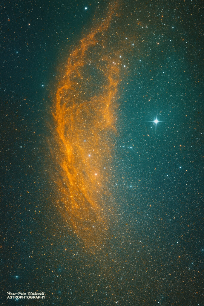 Der California-Nebel liegt in einer Entfernung von etwa 1.000 Lichtjahren von der Erde und gehört damit zu den relativ nahe gelegenen Nebelregionen innerhalb unserer Milchstraße. Seine tatsächliche Ausdehnung beträgt rund 100 Lichtjahre, was ihn zu einem der größeren Objekte seiner Art macht. Am Himmel erscheint er über drei Grad lang – das entspricht ungefähr dem Sechsfachen des Vollmonddurchmessers. Damit zählt er zu den ausgedehntesten Emissionsnebeln, auch wenn seine geringe Oberflächenhelligkeit ihn visuell zu einer Herausforderung macht.Die rötliche Farbe des Nebels resultiert aus der sogenannten H-Alpha-Emission: energiereiche ultraviolette Strahlung regt den in der Nebelregion enthaltenen Wasserstoff an, wodurch charakteristisches rotes Licht ausgesendet wird. Hauptquelle dieser Anregung ist der helle, bläuliche Stern Xi Persei, ein massereicher Stern der Spektralklasse O7, der sich in unmittelbarer Nachbarschaft des Nebels befindet. Seine intensive UV-Strahlung ionisiert das umgebende Gas und bringt die Region zum Leuchten – ein Prozess, der typisch ist für sogenannte H-II-Gebiete, also Zonen ionisierten Wasserstoffs.
