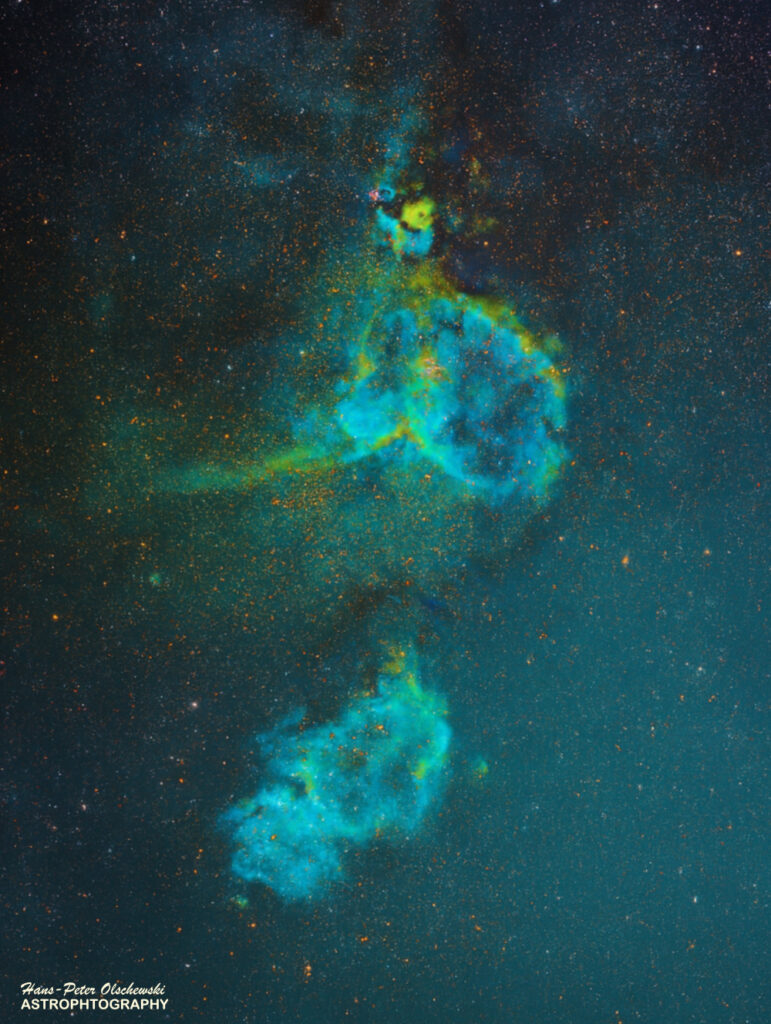 Wie sein benachbarter Zwilling ist auch der Seelennebel eine H-II-Region – ein Gebiet aus ionisiertem Wasserstoff, der durch die energiereiche UV-Strahlung massereicher, junger Sterne zum Leuchten angeregt wird. Diese Strahlung erzeugt nicht nur das charakteristische rötliche Leuchten, das auf H-alpha-Licht zurückzuführen ist, sondern formt auch das umliegende Gas zu faszinierenden Strukturen wie hellen Kanten, dunklen Säulen und bogenförmigen Schockfronten. In solchen Gebieten entstehen neue Sterne – eingebettet in dichte Staub- und Gaswolken, vor der direkten Beobachtung meist verborgen, aber im Infrarotspektrum gut erkennbar.