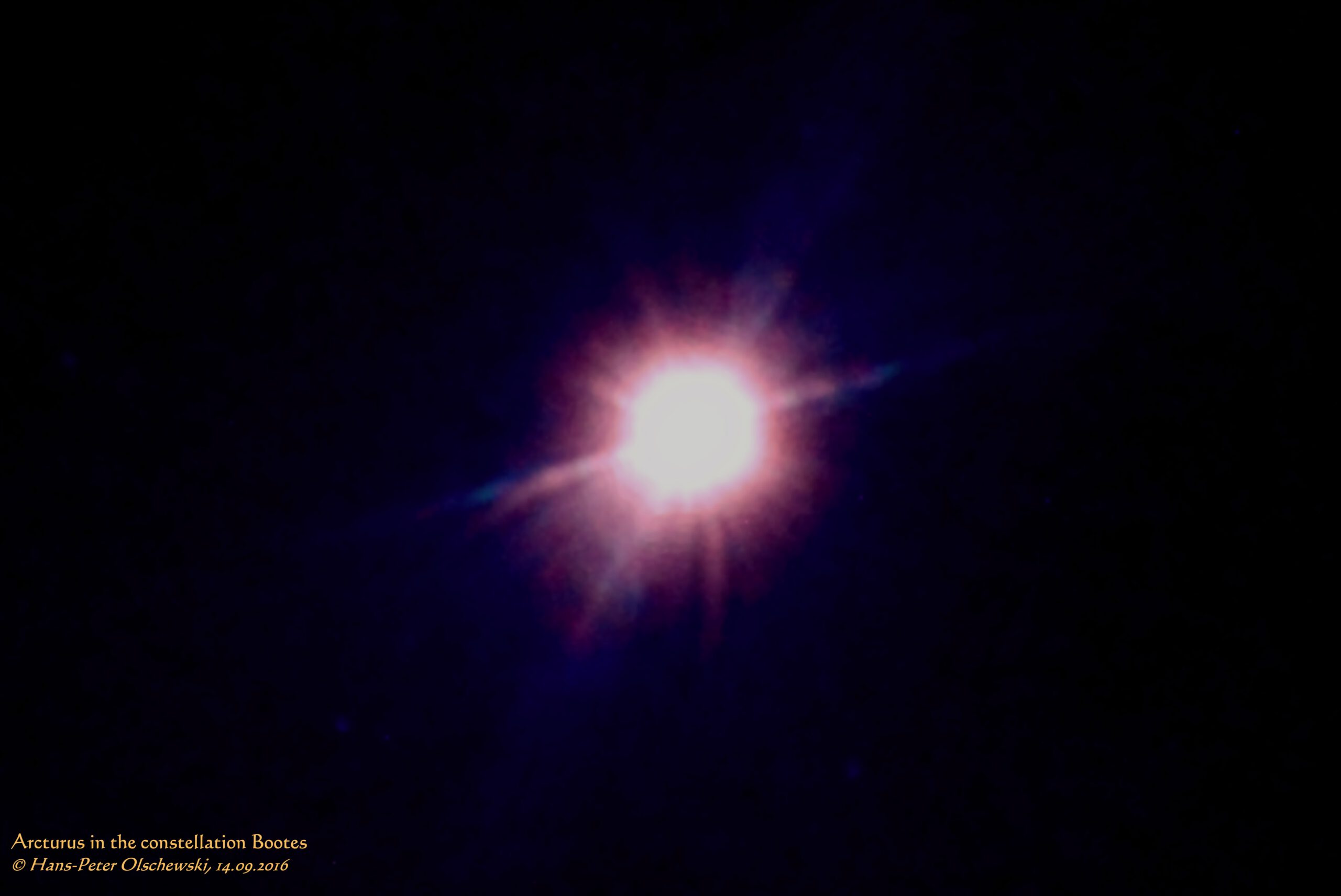 Arktur ist der hellste Stern im Sternbild Bärenhüter, auch Bootes genannt, und zählt zu den auffälligsten Himmelsobjekten am Nordhimmel. Mit einer scheinbaren Helligkeit von −0,05 mag ist er der vierthellste Stern am gesamten Nachthimmel. Sein orangefarbenes Licht weist darauf hin, dass es sich um einen kühlen Riesenstern handelt. Arktur gehört zur Spektralklasse K1, was ihm eine markante rötlich-orangene Färbung verleiht. Der Stern ist etwa 37 Lichtjahre von der Erde entfernt und damit relativ nahe. Sein Durchmesser beträgt rund 25 Sonnenradien, wodurch er am Himmel viel größer wäre, stünde er an der Stelle unserer Sonne. Die Leuchtkraft von Arktur übertrifft die der Sonne um das 170-Fache. Er ist rund 7,1 Milliarden Jahre alt und damit deutlich älter als unser Sonnensystem. Arktur befindet sich in einer Entwicklungsphase, in der er den Wasserstoff in seinem Kern bereits verbraucht hat. Stattdessen fusioniert er Helium und hat sich dabei zu einem Roten Riesen aufgebläht.