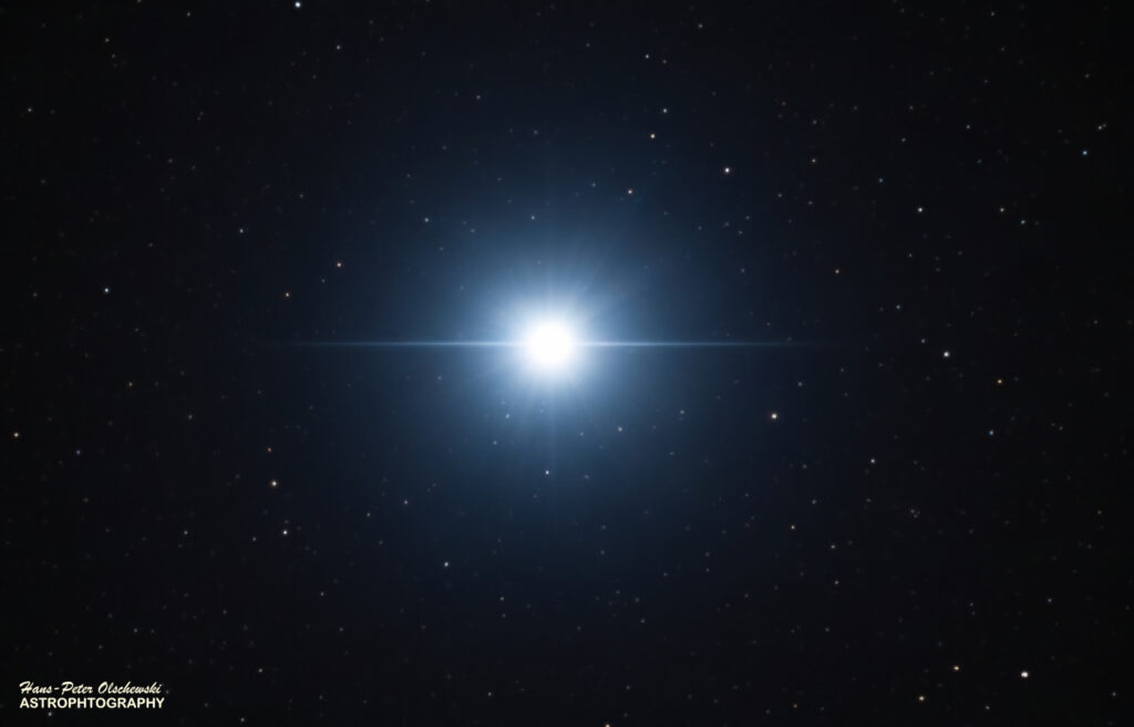 Sirius, auch als Hundsstern bekannt, ist der hellste Stern am irdischen Nachthimmel und Teil des Sternbildes Großer Hund. Er leuchtet mit einer scheinbaren Helligkeit von −1,46 mag und überstrahlt damit alle anderen Fixsterne. Etwa 8,6 Lichtjahre von der Erde entfernt, gehört er zu den uns am nächsten liegenden Sternsystemen. Sirius besteht aus zwei Komponenten – dem Hauptstern Sirius A und seinem lichtschwachen Begleiter Sirius B, einem Weißen Zwerg. Der Hauptstern ist rund doppelt so massereich wie unsere Sonne und etwa 25-mal heller. Seine Oberflächentemperatur beträgt rund 9 900 Grad Celsius, was ihm den charakteristischen weiß-bläulichen Glanz verleiht. Sirius B hingegen ist ein ausgebrannter Sternenrest mit der Größe der Erde, aber fast der Sonnenmasse. Das Paar umkreist sich gegenseitig in einem Zeitraum von etwa 50 Jahren. Schon die alten Ägypter verehrten Sirius, da sein heliakischer Aufgang den Beginn der Nilflut markierte. In vielen Kulturen galt er als Symbol für Wiedergeburt und göttliches Licht. Astronomisch gesehen ist Sirius B einer der ersten entdeckten Weißen Zwerge überhaupt. Seine Untersuchung trug entscheidend zum Verständnis des Endstadiums stellarer Entwicklung bei. Auch heute fasziniert das Doppelsternsystem durch seine Nähe und seine Klarheit am Himmel. Besonders in klaren Winternächten zieht Sirius als funkelnder Leitstern im Süden alle Blicke auf sich.