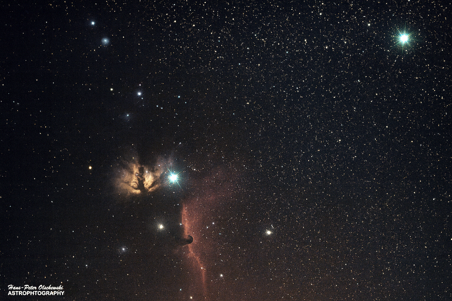 Der östlichste Stern im Gürtel, Alnitak, spielt dabei eine besondere Rolle, denn in seiner unmittelbaren Umgebung befinden sich zwei der faszinierendsten und bekanntesten Nebel der Region: NGC 2024, auch Flammennebel genannt, und IC 434, die Heimat des berühmten Pferdekopfnebels.